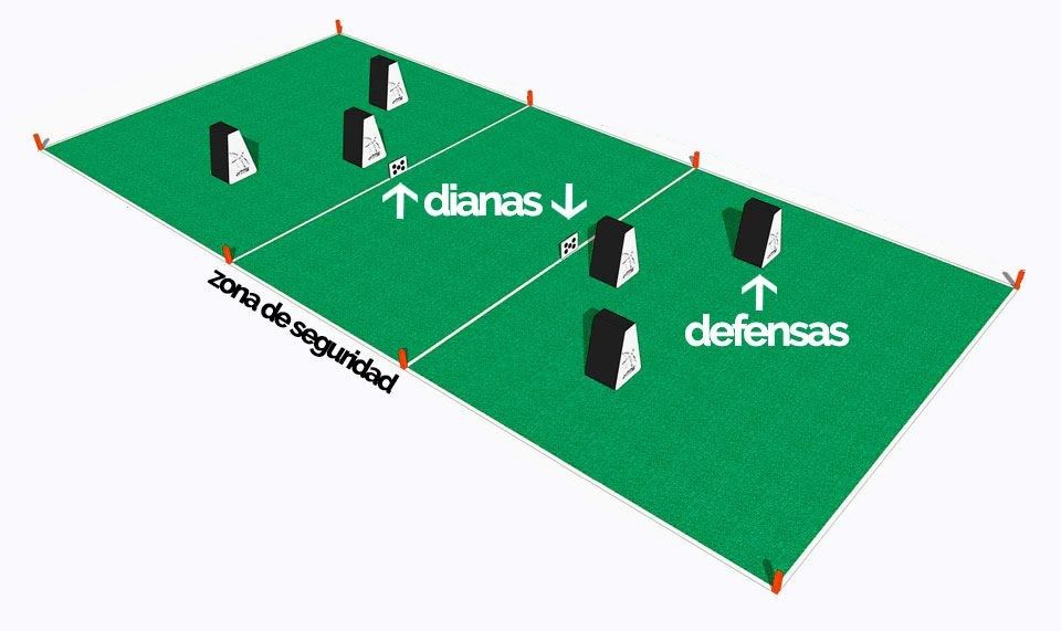 El terreno de juego se distribuye en 3 zonas, un campo de acción para cada equipo y la zona segura que se encuentra en el medio de los dos. En la zona segura estarán las flechas, no se puede disparar a nadie que haya dentro ni se pueden lanzar flechas desde allí para puntuar. Se comenzará la partida, colocando a cada equipo en los extremos opuestos del campo con sus arcos, y tendrán que ir corriendo a la zona segura a por las flechas.